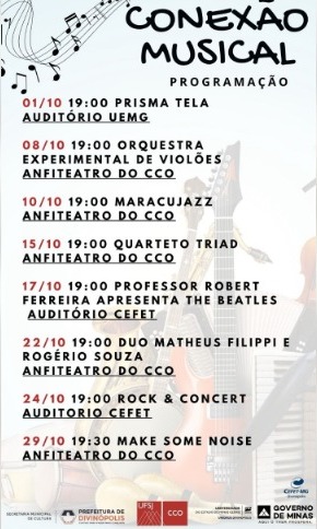 A Diretoria do CEFET-MG, campus Divinópolis, informa a todos os membros da comunidade acadêmica sobre o Conexão Musical – 1º Encontro de Música Universitária em Divinópolis, que acontecerá durante todo outubro.